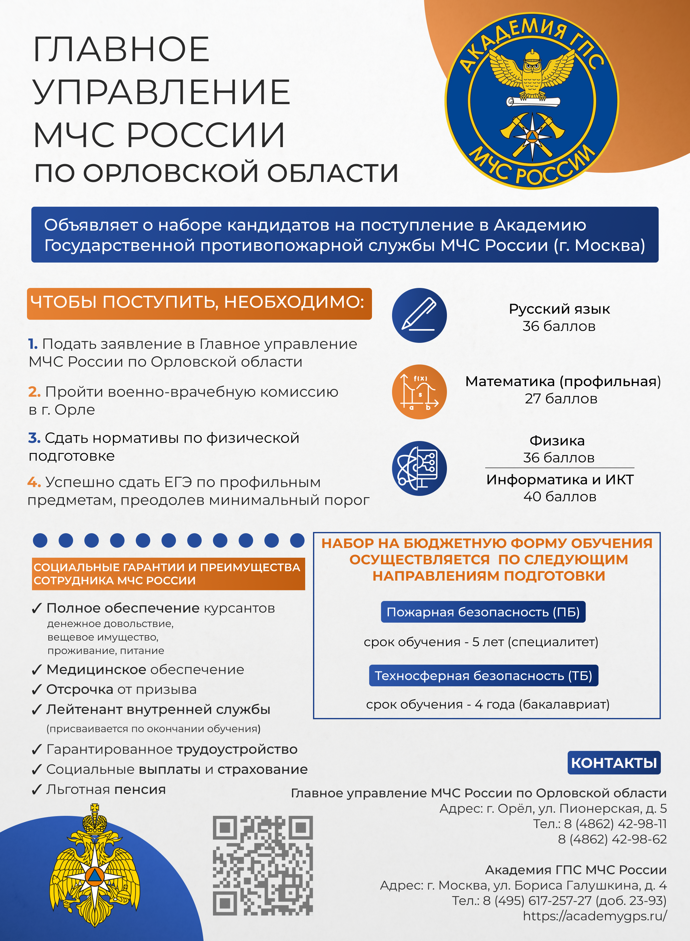 Главное управление МЧС России по Орловской области проводит набор кандидатов на поступление в 2026 году в образовательные учреждения высшего образования МЧС России по очной форме обучения за счет средств федерального бюджета на основе целевого приема.